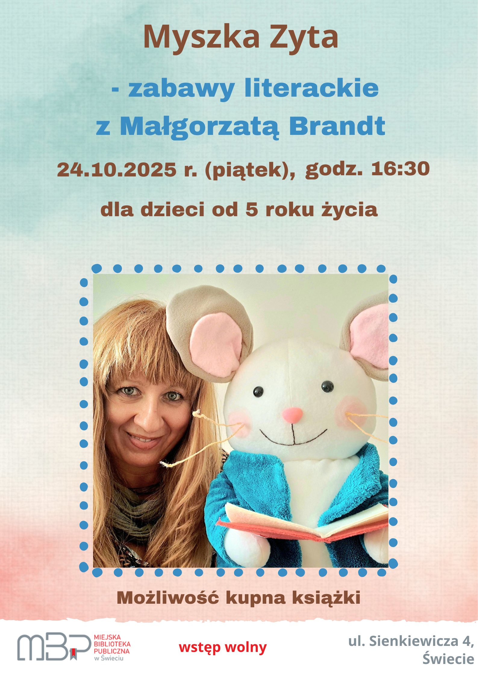 Zapraszamy wszystkie dzieci od 5 roku życia na wyjątkowe spotkanie „Myszka Zyta – zabawy literackie z Małgorzatą Brandt”, które odbędzie się 24 października 2025 r. (piątek) o godzinie 16:30 w Miejskiej Bibliotece Publicznej w Świeciu przy ul. Sienkiewicza 4. W programie zabawy literackie, możliwość kupna książki i zdobycia autografu autorki oraz spotkanie z sympatyczną Myszką Zytą.