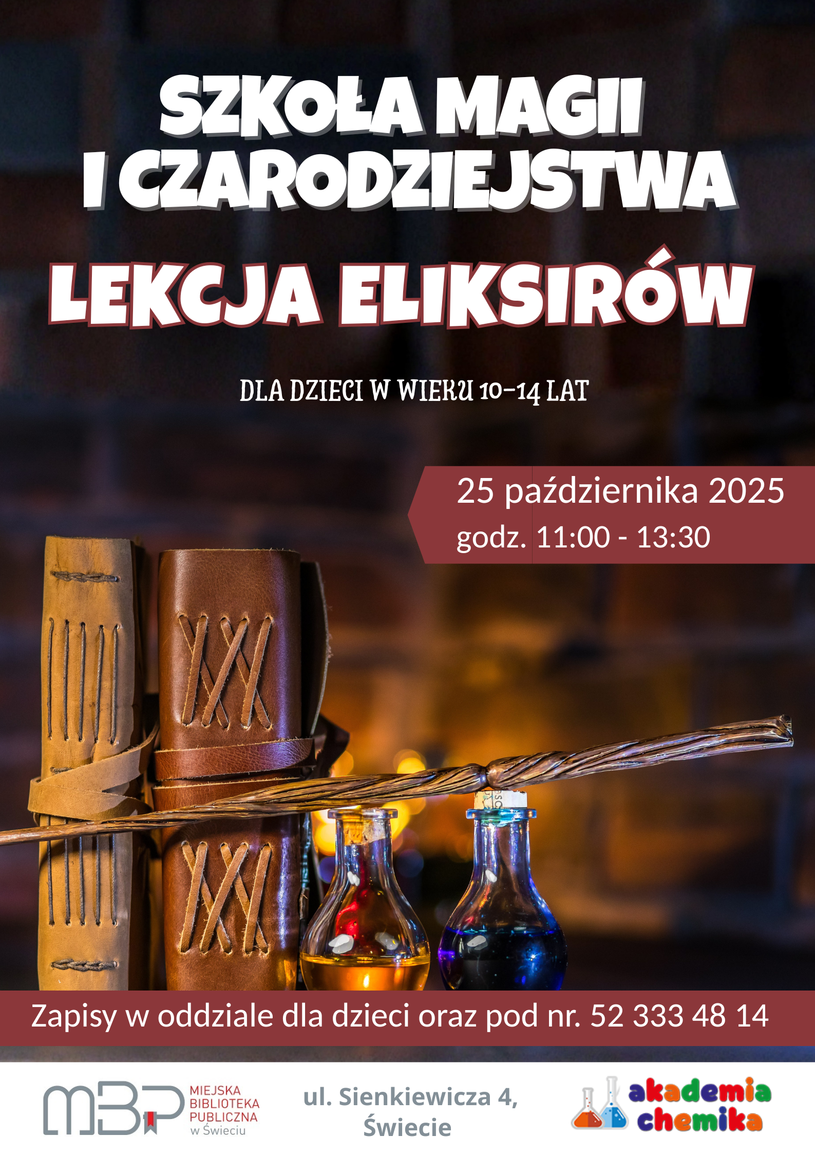 Szkoła Magii i Czarodziejstwa – lekcja eliksirów prowadzona przez Akademię Chemika – niezwykłe warsztaty dla dzieci w wieku 10 – 14 lat przeznaczone zarówno dla młodych czarodziejów, jak i przyszłych naukowców. Dzieci, wcielając się w uczniów magicznej szkoły, przeprowadzą prawdziwe eksperymenty chemiczne przypominające tworzenie eliksirów. W bezpiecznej i pełnej humoru atmosferze poznają tajniki nauki ukryte w magii, a każda reakcja chemiczna stanie się małym zaklęciem. Na zajęcia obowiązują zapisy pod numerem tel. 52333 4814.